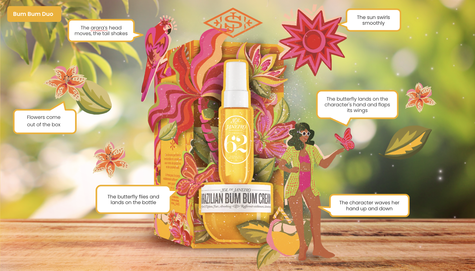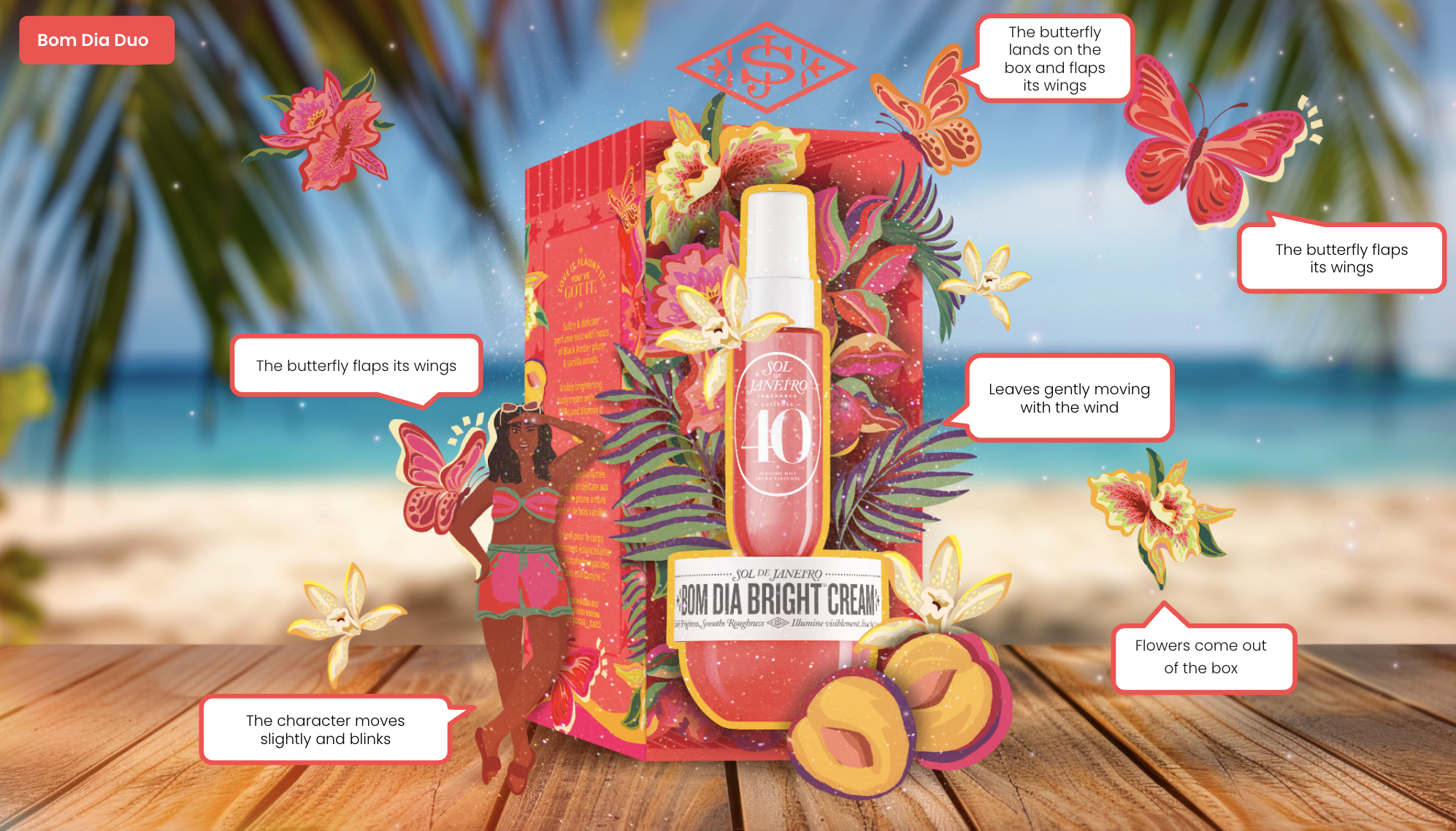 Brief: propose an animated frame to enhance the beauty of Sol de Janeiro packaging during the holidays season. Each packaging has its own composition, all gathered in 2 only web link experiences.